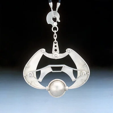 Inspired by an antique crane used to move ice-blocks, this piece holds instead a sterling silver locket-bead. The wearer can store something precious of their own, in the locket-bead, and symbolically replace the once precious ice-block.
